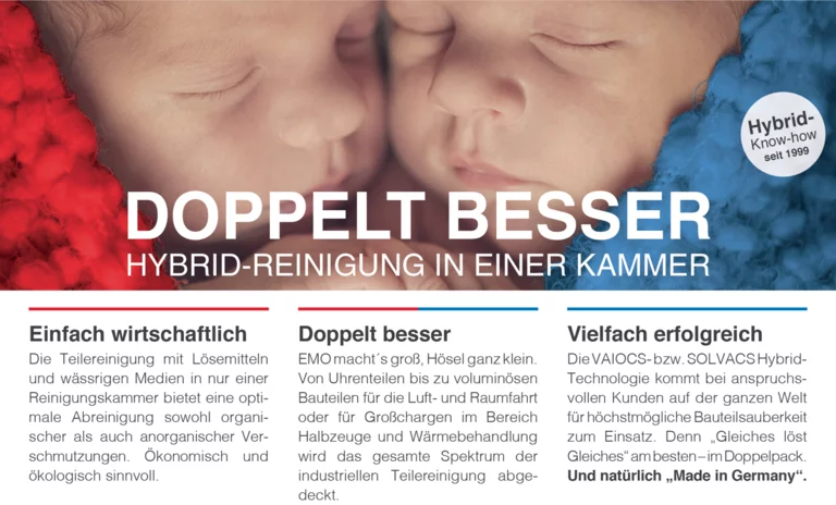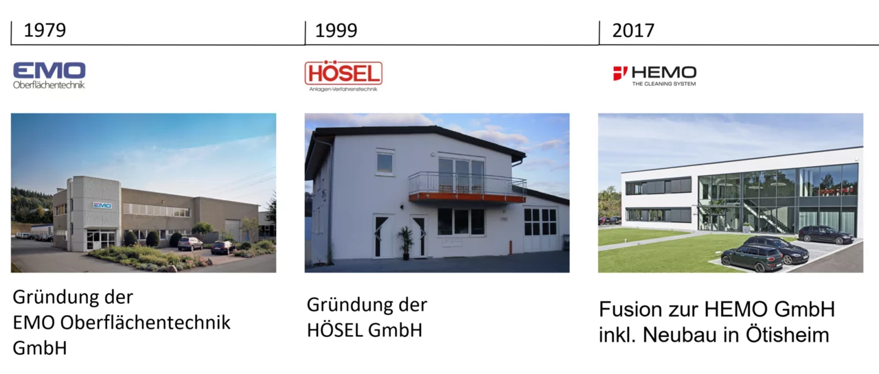 Die HEMO GmbH entstand 2017 aus der Fusion der EMO Oberflächentechnik GmbH und der Hösel GmbH. Das Unternehmen zählt zu den weltweit führenden Herstellern von Teilereinigungsanlagen für Lösemittel- und Hybridverfahren. Mit der Entwicklung des patentierten VAIOCS-Verfahrens im Jahr 1995 setzte HEMO Maßstäbe für die sichere Reinigung mit brennbaren Lösemitteln. Die innovative HYBRID-Technologie kombiniert Lösemittel und wässrige Medien in einem Reinigungssystem und ermöglicht so höchste Reinigungsqualität bei komplexen Anforderungen - und das seit dem Jahr 2000.